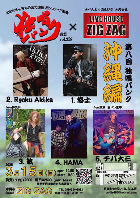 15日日曜日「チバ大三主催•独唱パンクVol.285 ZIGZAG編」